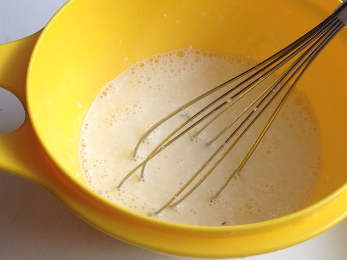 Приготовить заливку. Смешать в миске куриные яйца и сливки (вместо сливок можно взять сметану). Посолить и поперчить по вкусу. Хорошо перемешать венчиком.