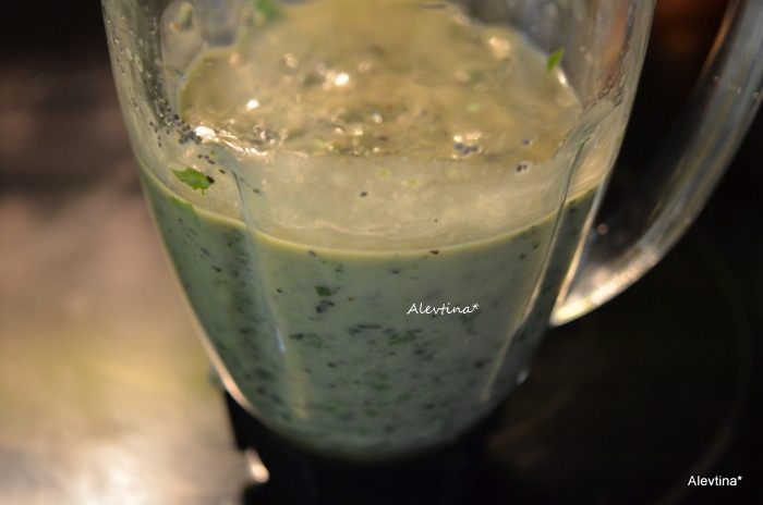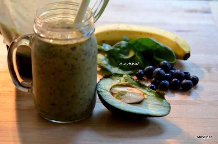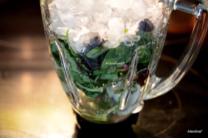 Молодые листья шпината помоем, сложим в блендер, а также очищенную от ядра и кожуры половинку авокадо, очищенную голубику, банан, воду, семена чиа, мед и колотый лед.