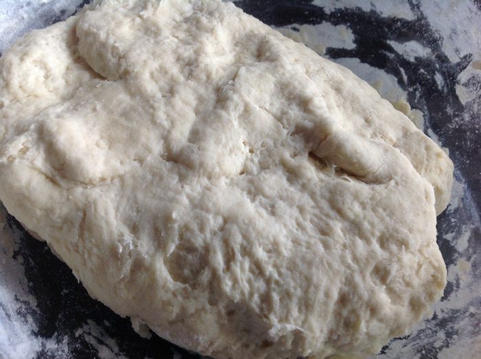 Добавьте просеянную муку и замесите тесто. Тесто должно быть слегка липким. Накройте тесто полотенцем и оставьте на 20 минут.