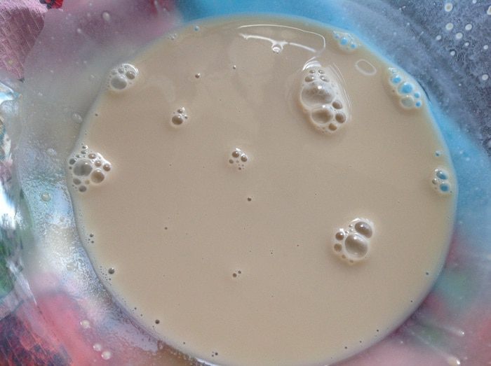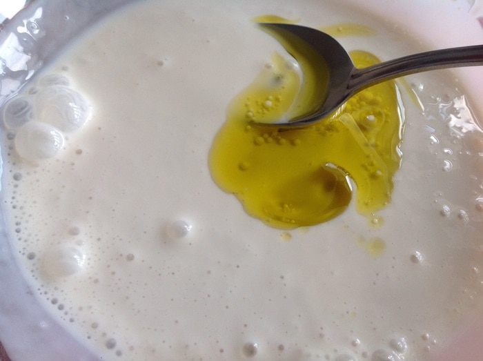 Смешайте с кефиром до растворения дрожжей, добавьте 1 ст.л. оливкового масла, размешайте.