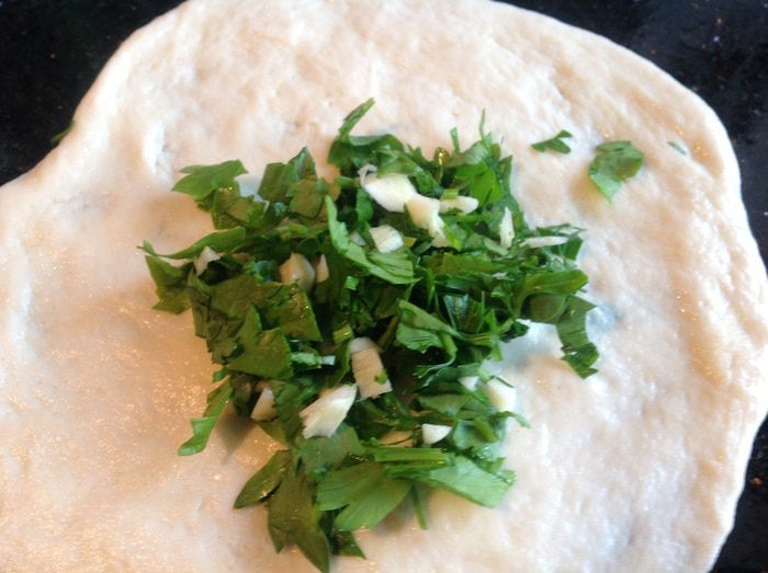 Для начинки зелень вымойте, обсушите бумажным полотенцем и мелко порубите (можно добавить чеснок, но это по-желанию).