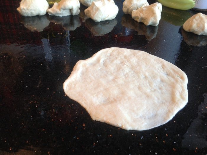 Тесто разделите на 8 частей. Смажьте маслом поверхность стола и слегка раскатайте тесто.