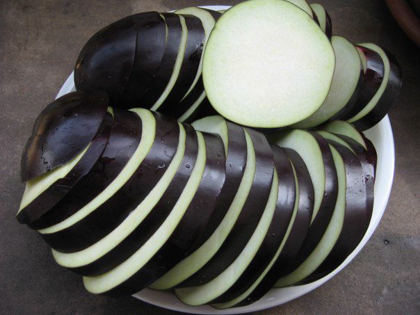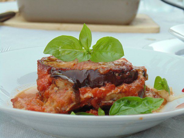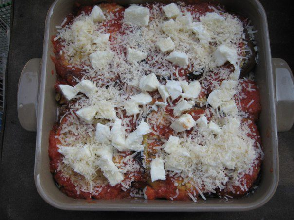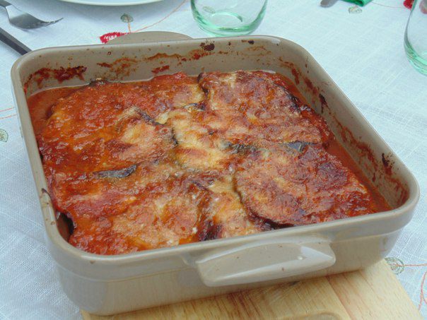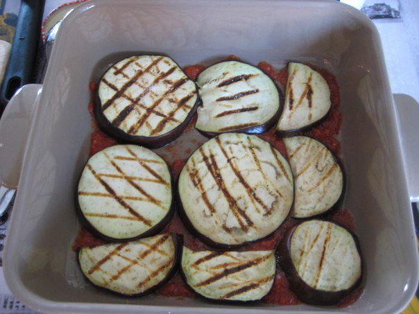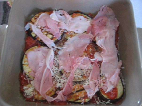 Форму для запекания смазать оливковым маслом, выложить пару ложек томатного соуса, выложить баклажаны в один слой, посолить, посыпать итальянскими травками, смазать томатным соусом, положить ломтики прошутто, посыпать тертым пармезаном.