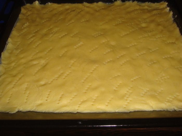 Нагреть духовку до 180 градусов. Противень смазать маслом. Тесто раскатать, положить в противень, наколоть вилкой.