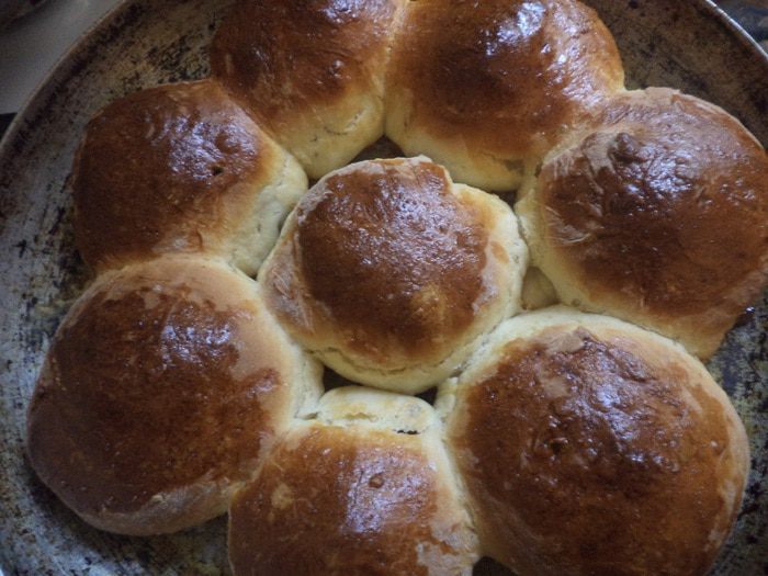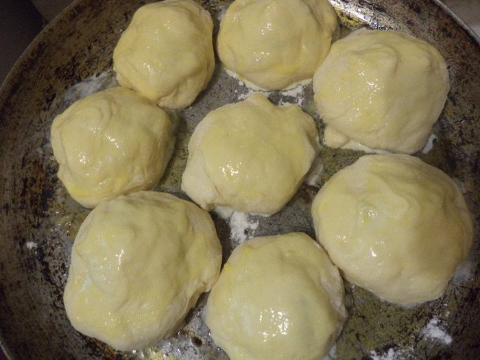 100 гр сливочного масла растопить, затем обмакнуть каждый шарик в растопленное масло и выложить шарики на большую круглую форму для выпечки швом вниз, на некотором расстоянии друг от друга, в виде круглого пирога. Оставить на 30 мин для увеличения в объёме.