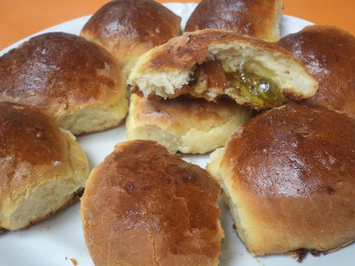 Внутрь каждого шарика положить по 1 чайной ложке начинки, края защипнуть, сформировать шарик.