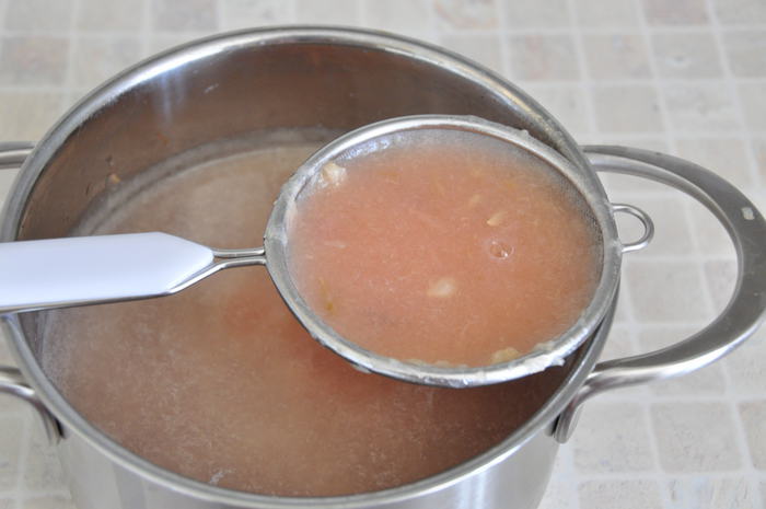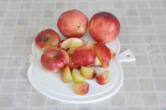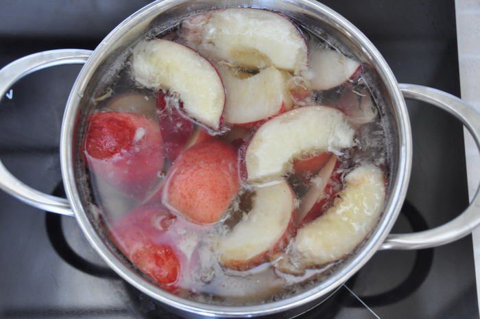 В кастрюлю налить воду, опустить кусочки персиков, добавить сахар (количество сахара зависит от сладости персиков, я положила ¾ стакана и лимонад получился по сладости в самый раз). Довести до кипения, перемешать, уменьшить огонь и варить в течение 3 минут.