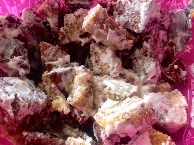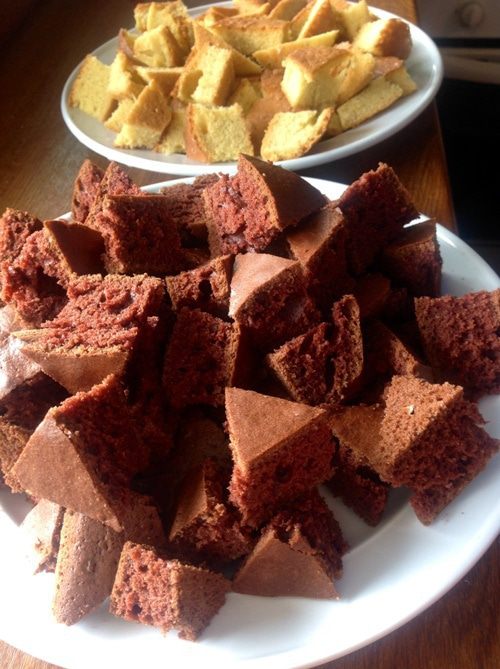 Коржи спеклись, остыли, разрезаем их на произвольные кусочки.