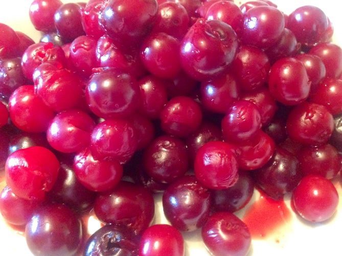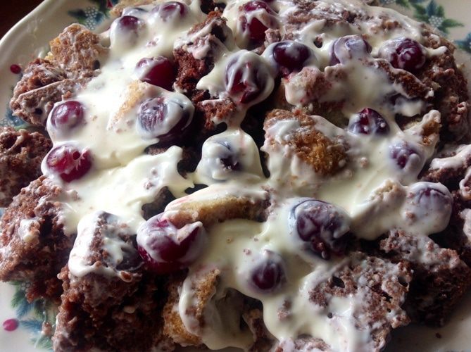 Перемешанные с кремом кусочки коржей и белых и черных, выкладываем на большое блюдо, посыпаем вишней без косточек и смазываем небольшой порцией крема. Так мы собираем торт до тех пор, пока не закончатся кусочки коржей.