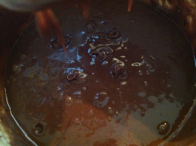 Темное тесто: 3 яйца взбить с 100 гр сахара + 1 чайная ложка соды + 1 щепотка соли + 100 гр растопленного сливочного остывшего масла + 1 плитка черного шоколада растопленного (100 гр) + 200 гр просеянной муки. Выпекаем корж в форме размером 25*30 см при температуре 180 градусов минут 25-30.