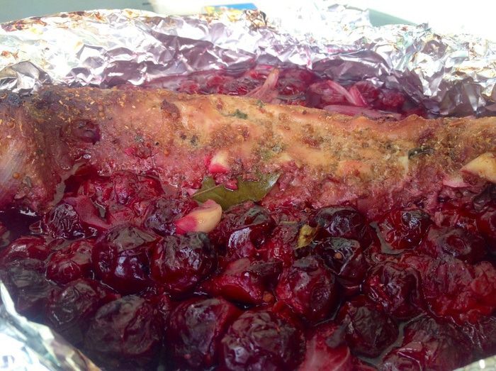 Выкладываем наше мясо на несколько листов фольги, чтобы не вытек сок, посыпаем помытой вишней, выкладываем порезанный лук и лавровый лист.