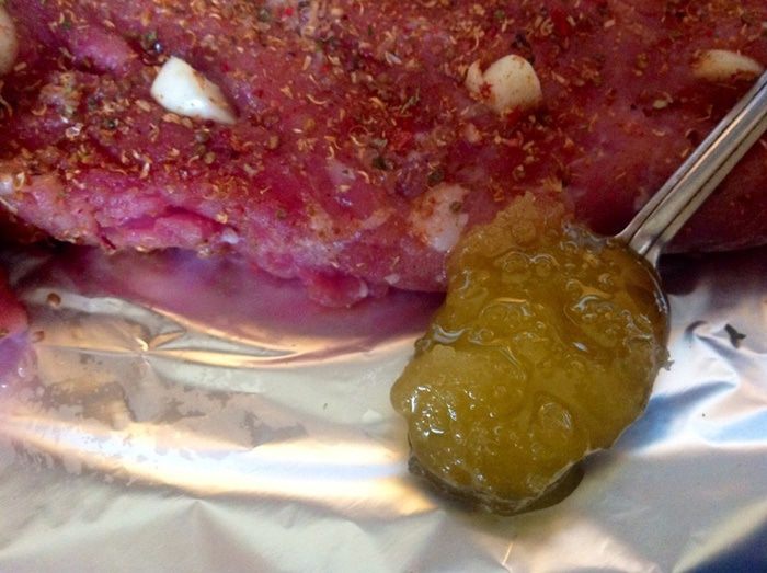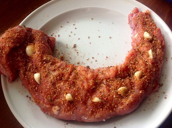 Промытое мясо отделим от пленок, хорошо промакнем бумажными полотенцем, делаем прорезы, начиним эти прорезы разрезанным на кусочки чесноком и хорошо обмажем солью и густо специями.