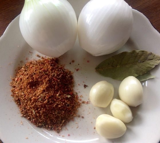 У меня была свиная филейка, вы можете взять любое мясо, которое предпочитаете. Приготовим на тарелке лук, чеснок, лавровый лист и специи для шашлыка.
