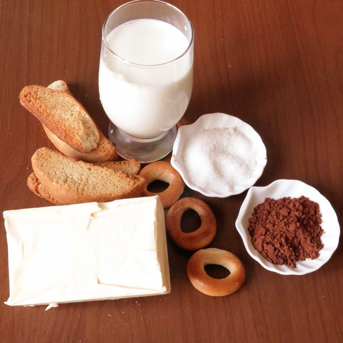 Подготовим ванильные сухари, по стакану молока и сахара, какао, пачку сливочного масла, сушки ванильные.