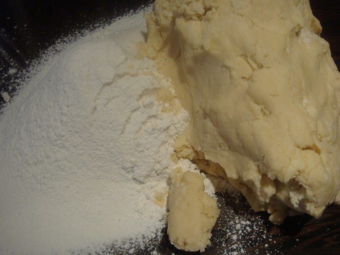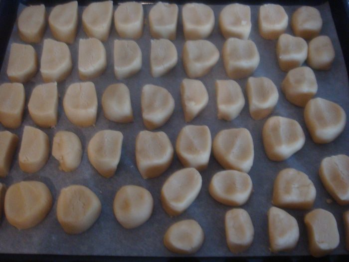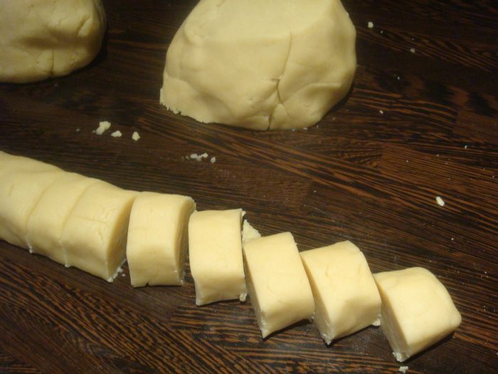 Тесто делим на части, каждую часть скатываем в колбаску и нарезаем на кусочки примерно 2-3 см.
