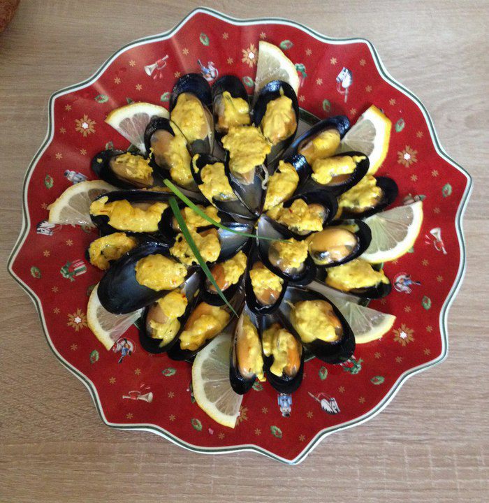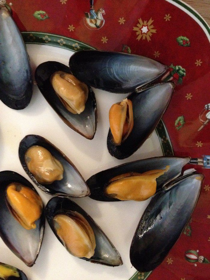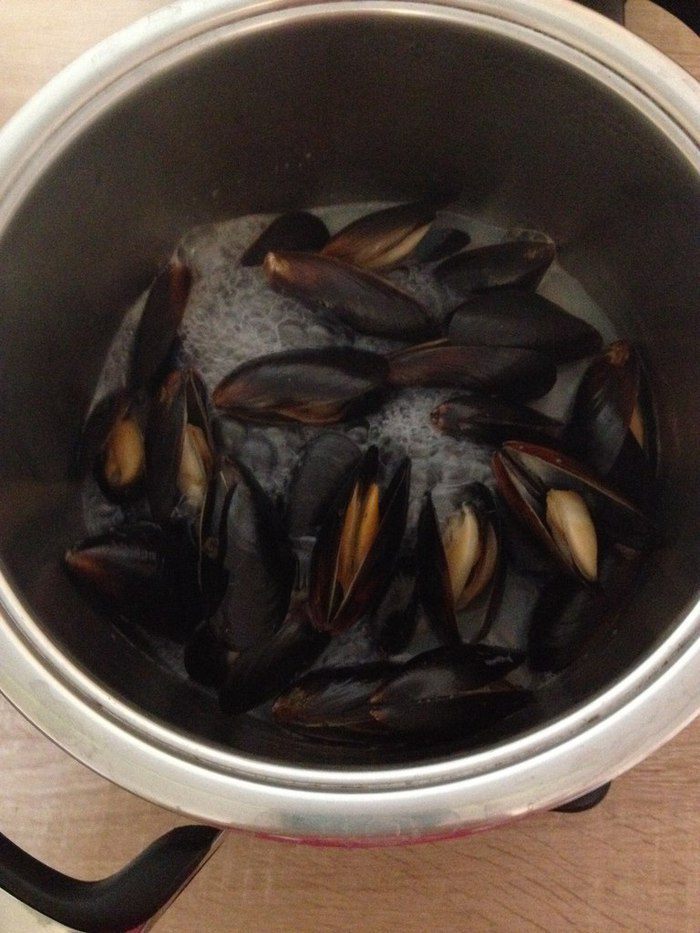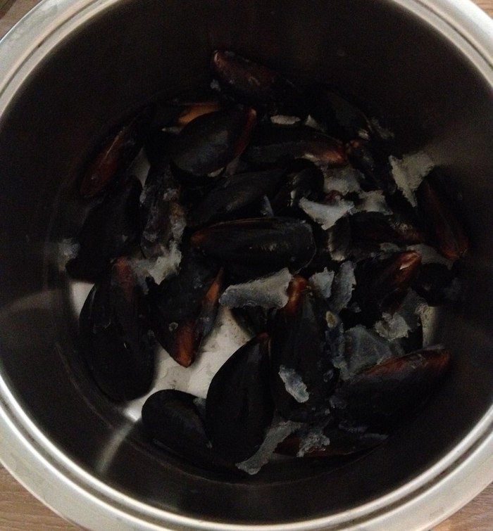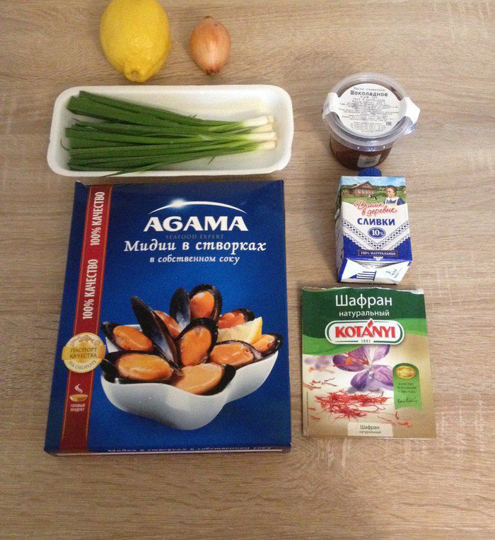 Берем основные продукты. Мидии выбираем свежие, в данном случае чилийские очень подошли. Шафран нитями. Сливки 10 процентов, я жирнее не люблю просто. Масло сливочное. Я использовала ложку шоколадного, понравилось, цвет не изменился, добавляет чуточку приятной сладости.