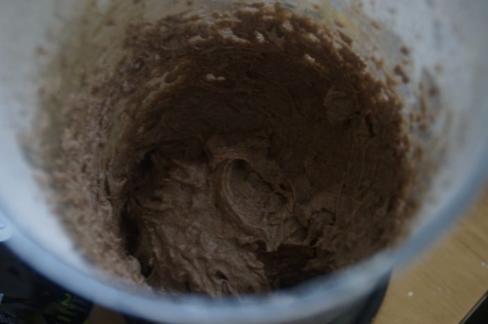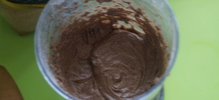 Пока кекс выпекается приготовим крем. Для этого Масло взобьем с сахарной пудрой и какао, затем добавим молоко, коньяк и снова взобьем в пышную массу.