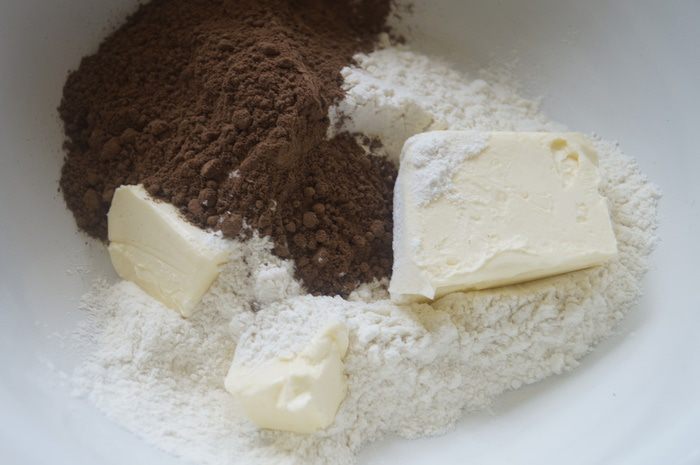 Смешать сухие ингредиенты: муку, какао, сахар и разрыхлитель. Добавить к ним сливочное масло и растереть в крошку.