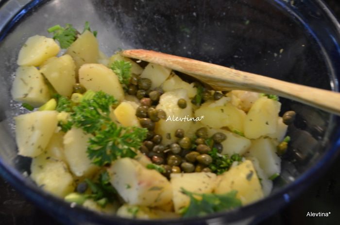 Добавить в картофель пряности сухие или свежие мелко порубленные каперсы.