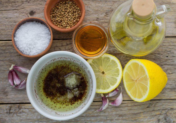 Для маринада смешать оливковое масло, мёд, лимонный сок (1 ст. л.), лимонную цедру (1/4 ч. л.), молотый кориандр, приправить солью и перцем, добавить давленый чеснок. Перемешать до однородности.