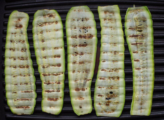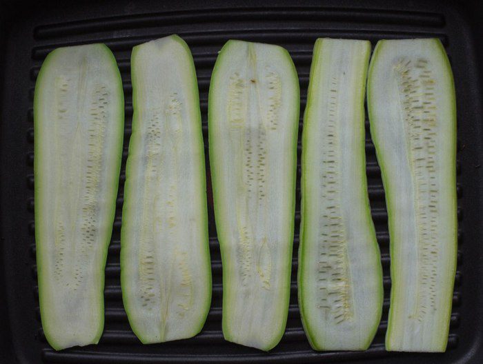 Обжарить на сковороде-гриль до золотистых полосок.
