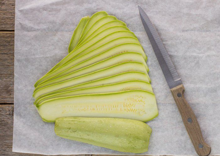 Кабачки помыть и нарезать тонкими ломтиками вдоль.