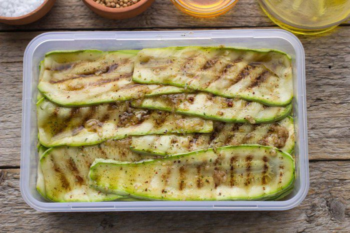 Выложить кабачки слоями в контейнер, каждый слой обильно смазать маринадом. Оставить в холодильнике на 2-3 часа. Идеально на ночь.
