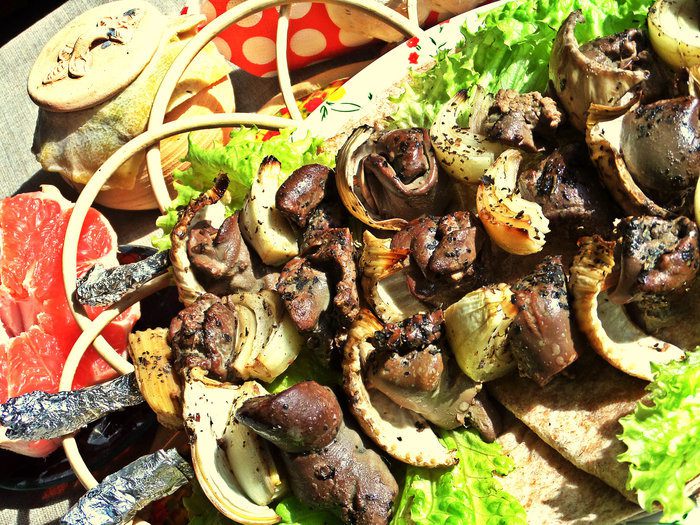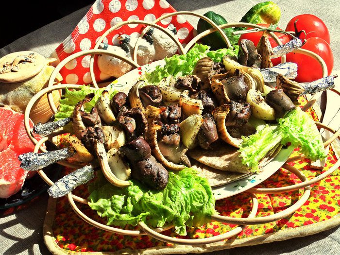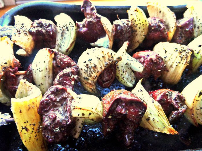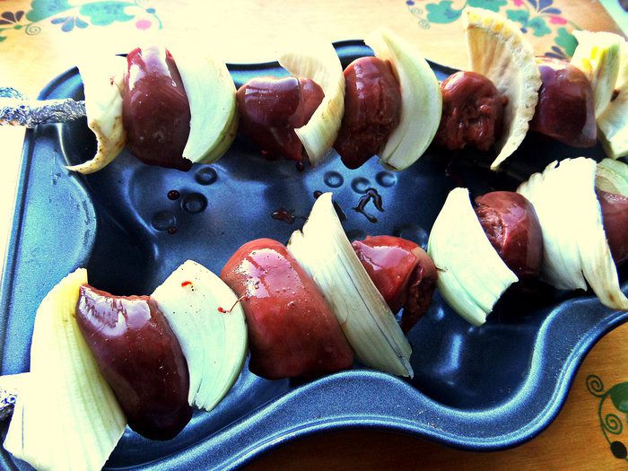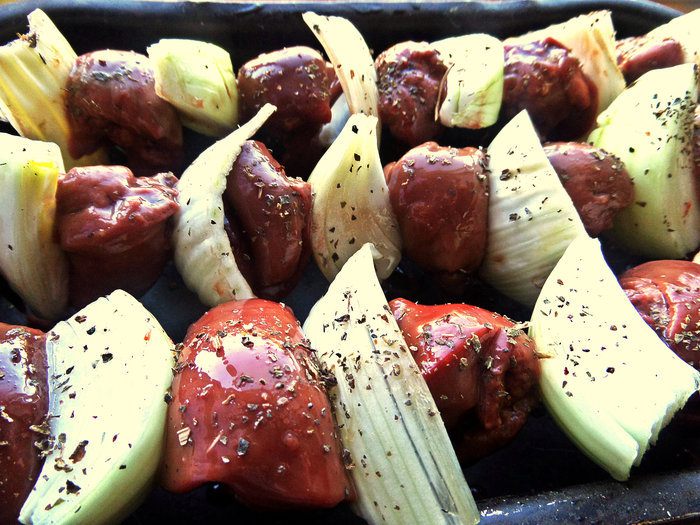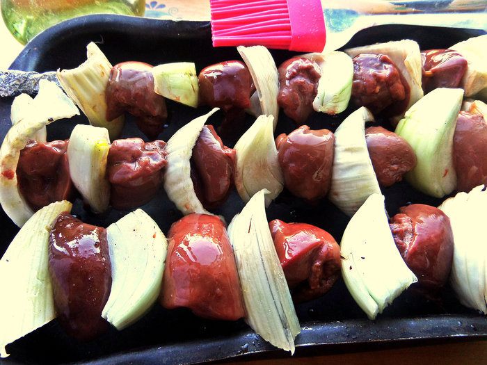 Нанизывать чередуя кусочки печени и овощей (в домашних условиях-на шпажки, обернув концы фольгой).