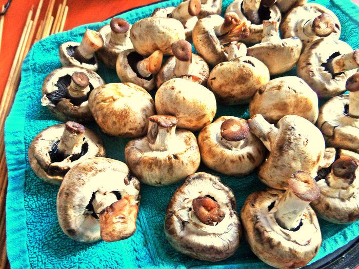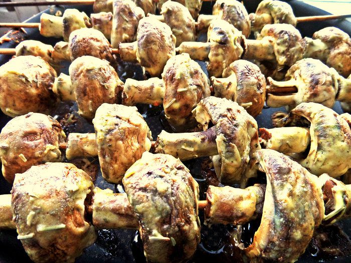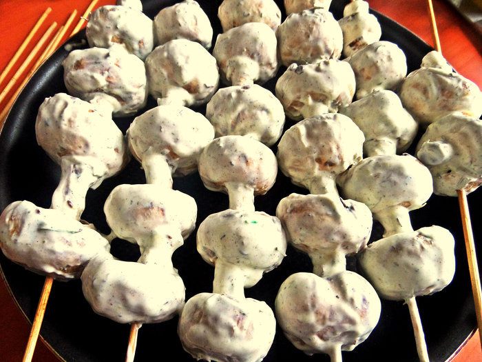 Хорошенько обвалять партиями грибочки. Нанизывать на шпажки или шампура. Мне понадобилось 6 деревянных шпажек.