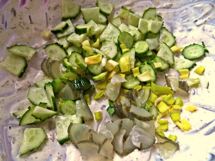 В остатках сметаны в это время можно приготовить мини-салатик из свежего и маринованного огурца и лука.