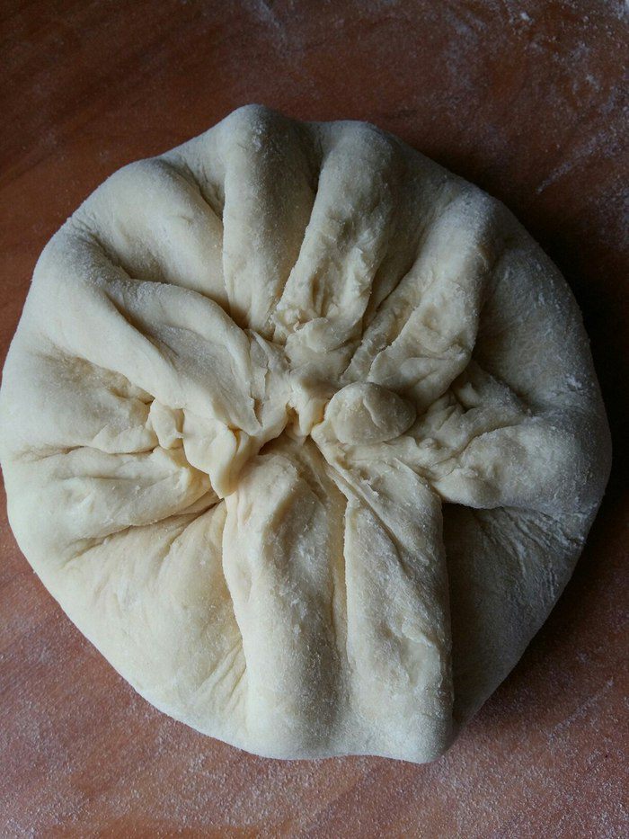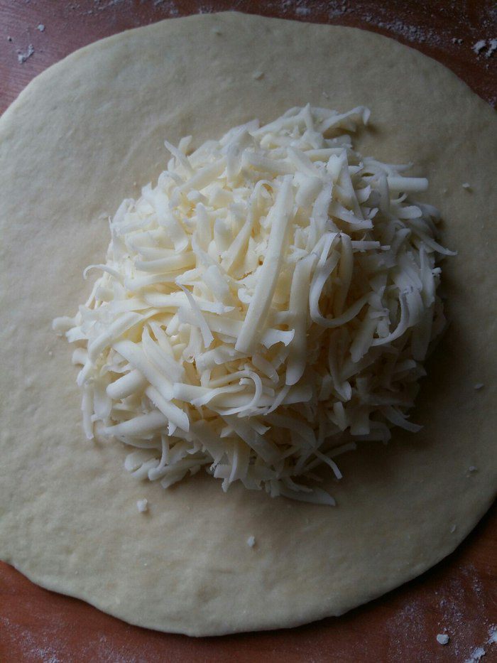 Натереть сыр на крупной терке. На сколько частей вы разделите тесто, на столько частей разделите и подготовленный сыр. Раскатать лепешку руками, помогая скалкой. Добавить в центр лепешки сыр. Сыра должно быть ровно столько же, сколько и теста, тогда и хачапури будет вкусный.