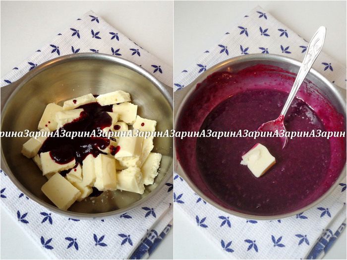 Для начинки смешать белый шоколад с пюре из черной смородины. Нагреть на водяной бане, хорошо перемешивая до растворения шоколада. Добавить в теплую смесь кусочек масла, перемешать. Пробить блендером. Переложить начинку в кондитерский мешок и убрать в холодильник для охлаждения.