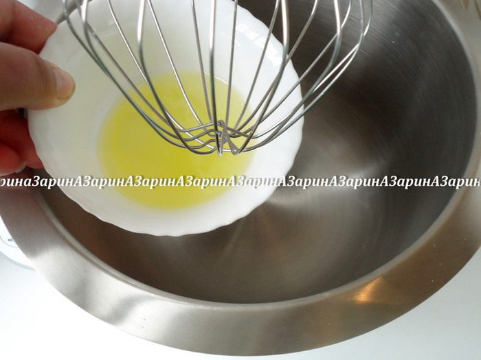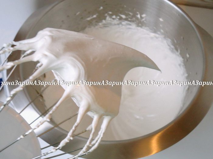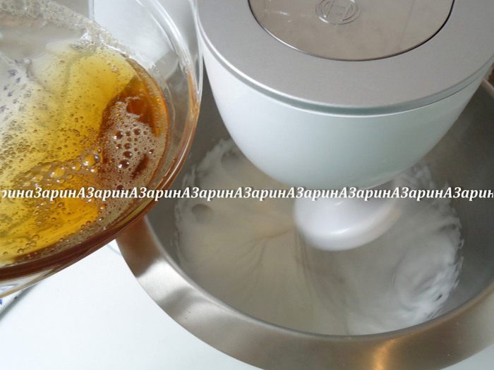 Влить сироп тонкой струйкой во взбитые белки, не прекращая процесс взбивания.