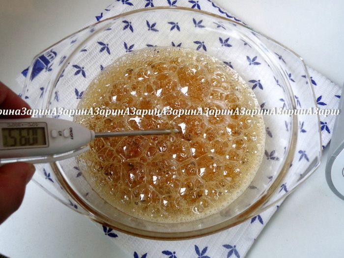 Одновременно следить за температурой сиропа. Когда она достигнет 118 градусов, убрать с огня.
