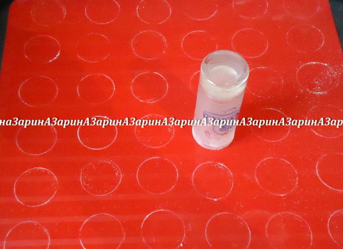Поместить тесто в кондитерский мешок с круглой насадкой. Подготовить силиконовый коврик. Если у вас простой, не специальный коврик, то при помощи рюмки диаметром 4 см сделайте на коврике круги, окуная её в сахарную пудру.
