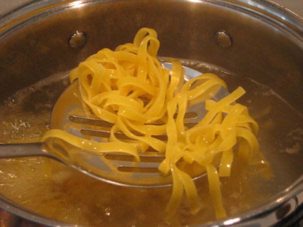 Тем временем отварить пасту в подсоленной воде, главное, пасты нужно 160 грамм, это примерно 1/3 стандартной упаковки в 500 грамм, не переусердствуйте, мы же не хотим ,чтобы кавалер объелся и завалился спать, его еще ждут подвиги!!! Сохранить несколько ложек горячей воды, в которой варилась паста.