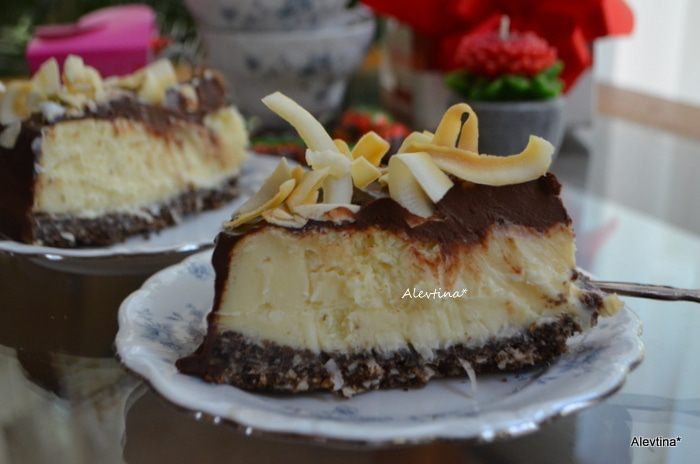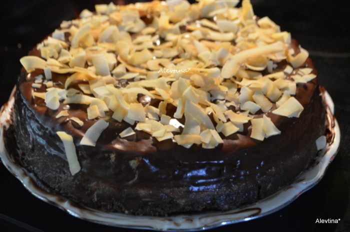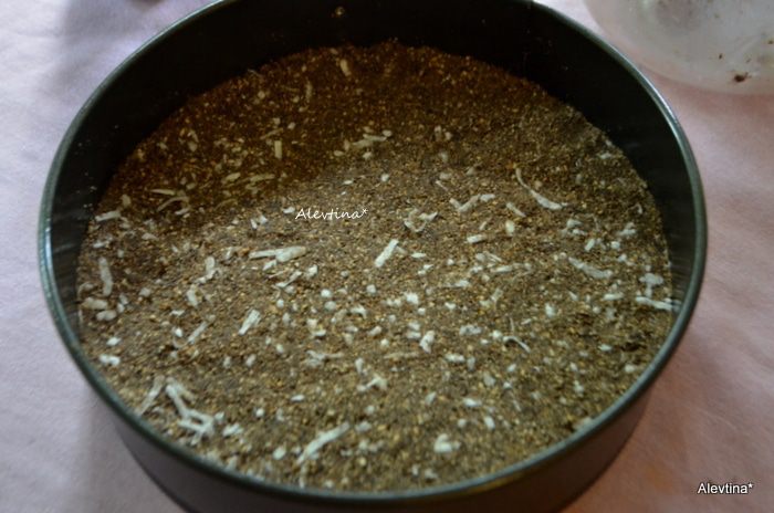 Используем шоколадное печенье ,размолоть в крошку выход должен быть 2 стакана. У меня вместо шоколадного печенья -печенье грэхем с добавлением 2 ст. л. какао. Разогреем духовку до 180 гр. Смажем дно съемной формы 23 см. Выложим на дно бумагу для выпечки, смажем вновь маслом. Смешаем крошку печенья с кокосовой стружкой можно не сладкой, щепотку соли, растопленное сливочное масло 80 грамм.