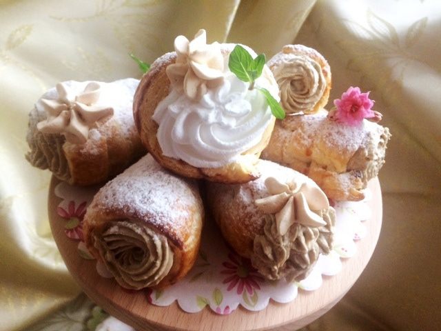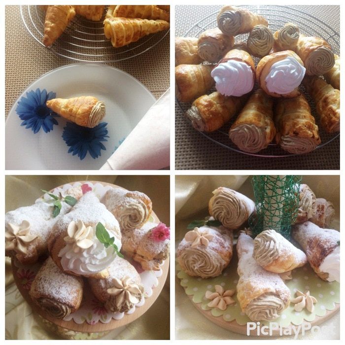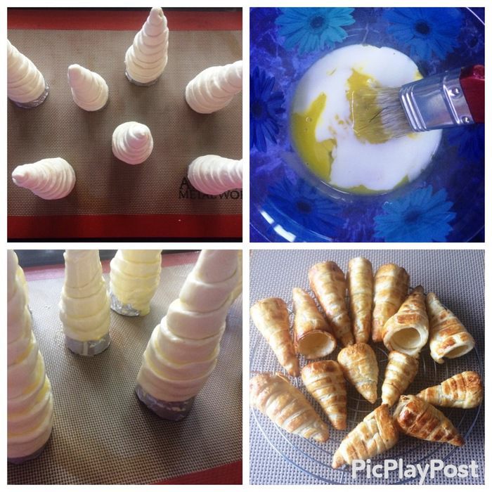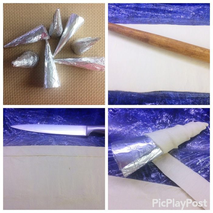 Чтобы испечь сами трубочки нам понадобятся металлические конусы. У меня их нет в наличии, но я выкрутилась, соорудив их из плотного картона и фольги. Пришлось повозиться, но что не сделаешь ради детей (это дополнительное время, которое ушло на процесс). У кого есть металлические конусы, тот сразу начинает с теста.