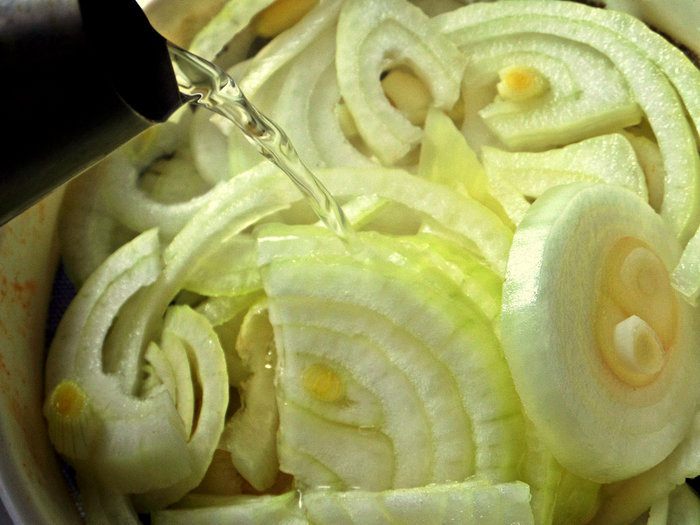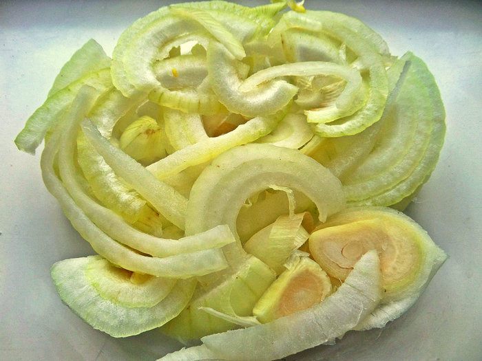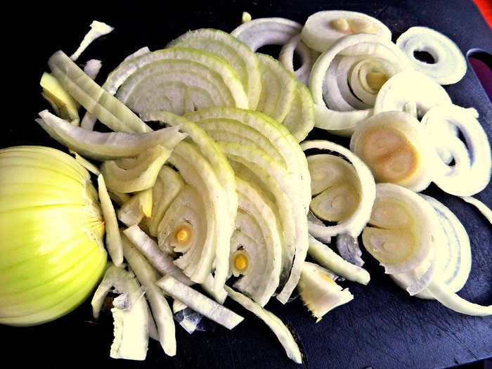 Две большие луковицы (300 г) очистить и нарезать кольцами или полукольцами.