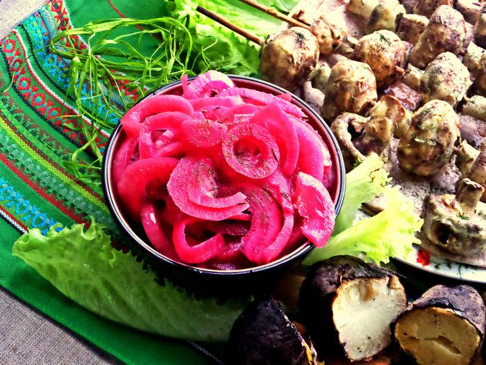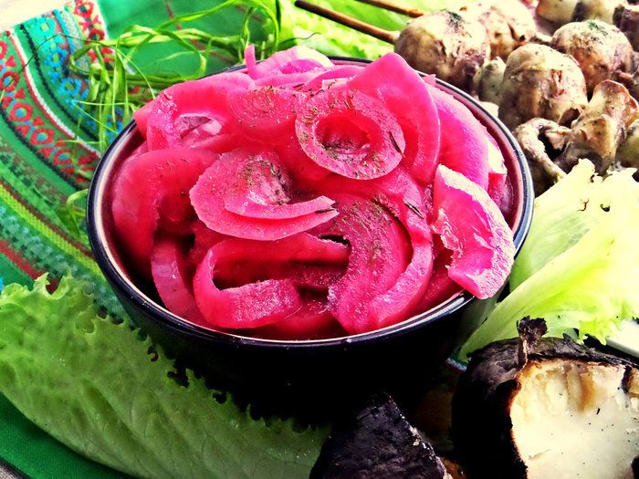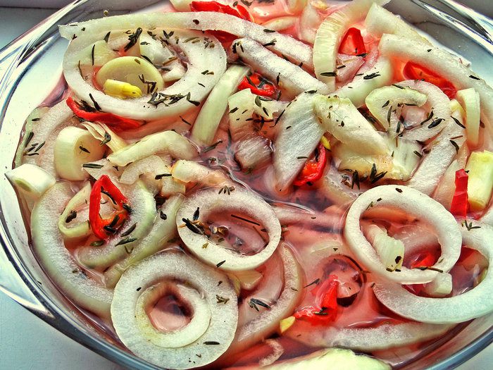 Хотя используем белый лук, закуска получается яркая, нарядная по-летнему и немного пикантная, как раз к шашлычку.