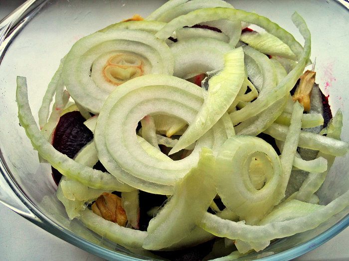Затем слой кружочков свекольных (если варёную использовать,то можно потом покрошить в салат!).