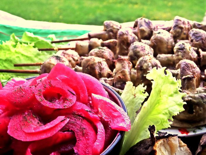Удачно сочетается лучок с запечёнными грибочками: http://www.edimdoma.ru/retsepty/74990-shashlyk-griby-v-smetane