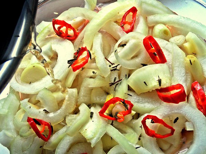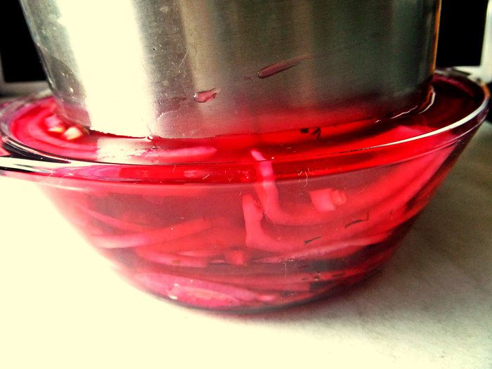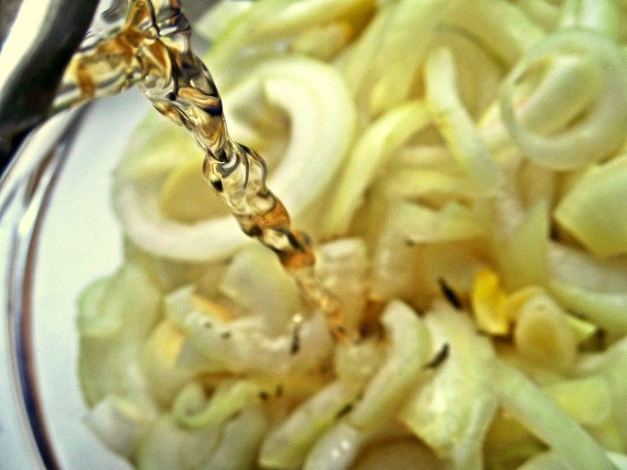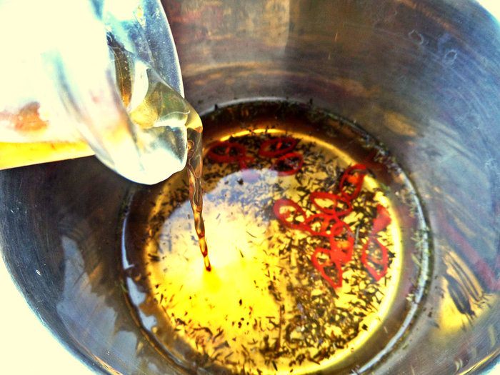 Нагреваем почти до кипения, но не кипятим, в конце вливаем яблочный или простой уксус.