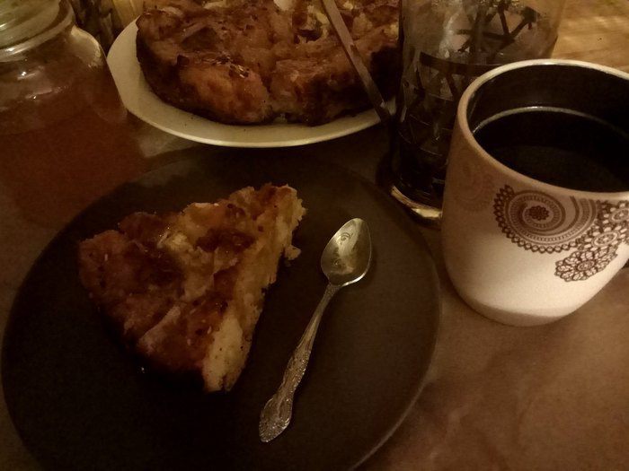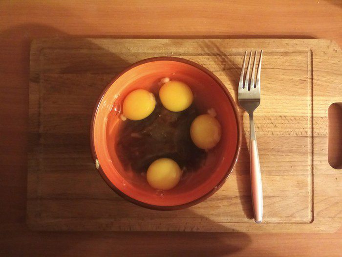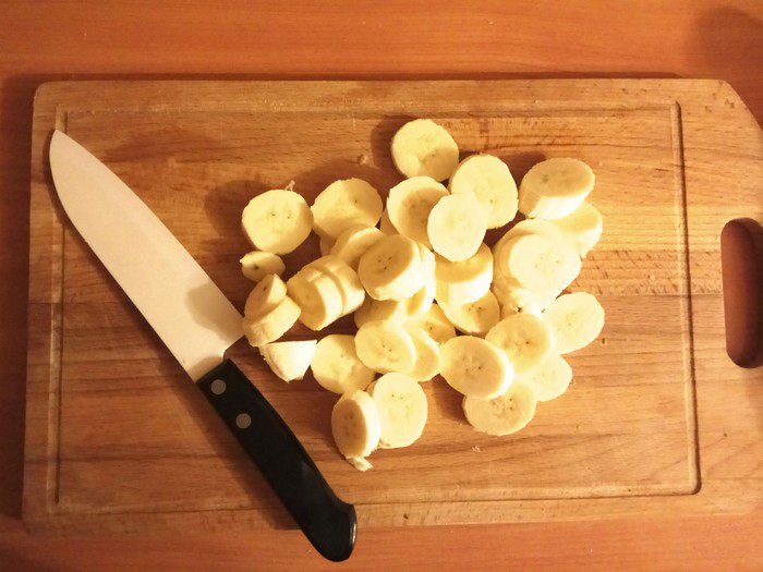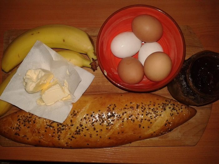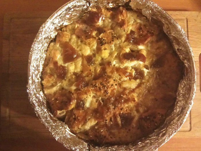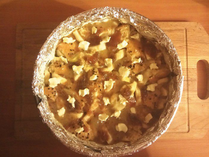 Если не хотим отмывать форму для выпечки от застывшей карамели, застилаем ее бумагой для выпечки или фольгой. Смазываем дно и края сливочным маслом, оставляем 20 г на верхнюю часть. Выкладываем кусочки батона, прокладываем бананом пустоты и заливаем яичной смесью. Отправляем в духовку на 15 минут.