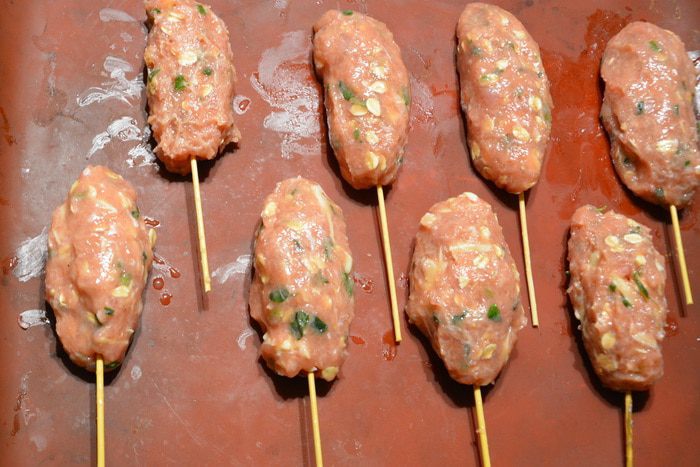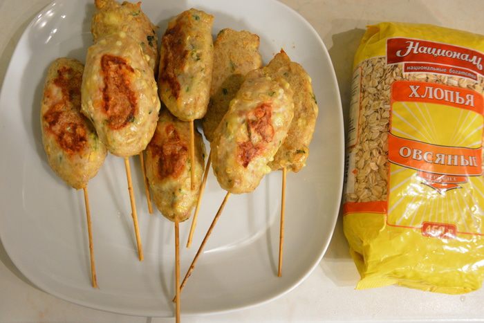 Слепить котлетки и насадить на шпажки, предварительно смоченные водой.