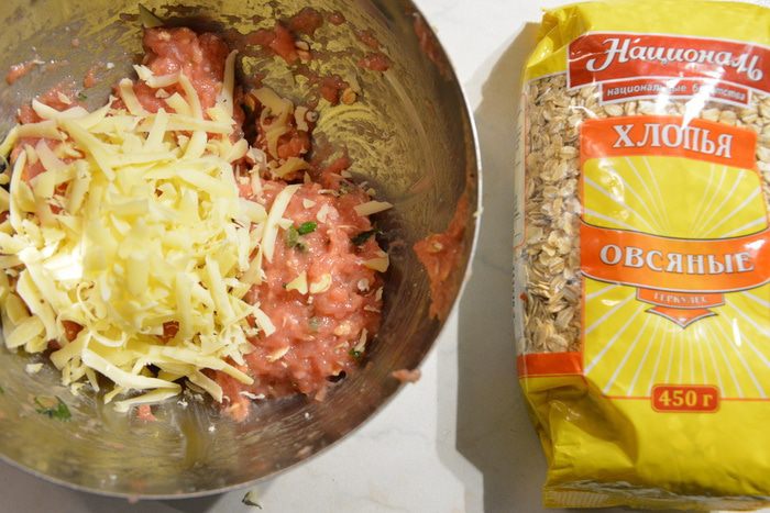 Твердый сыр натереть на терке и смешать с фаршем.