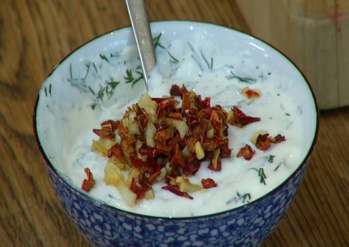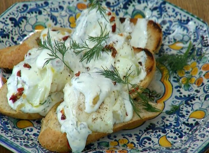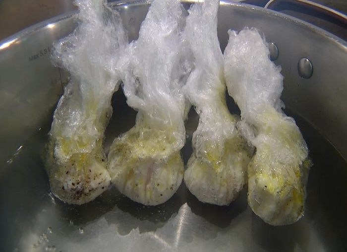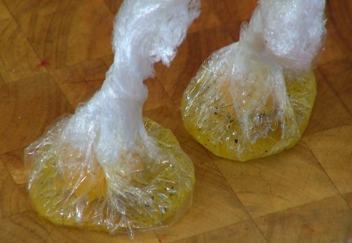Пиалу выстелить двойным слоем пищевой пленки, чтобы концы ее намного свешивались со всех сторон. Дно слегка посыпать солью, перцем, налить чуть-чуть оливкового масла и разбить яйцо, так чтобы желток остался целым, посолить его, поперчить и налить сверху еще немного оливкового масла. Соединить концы пищевой пленки и скрепить, чтобы получился мешочек. Так же подготовить остальные яйца.