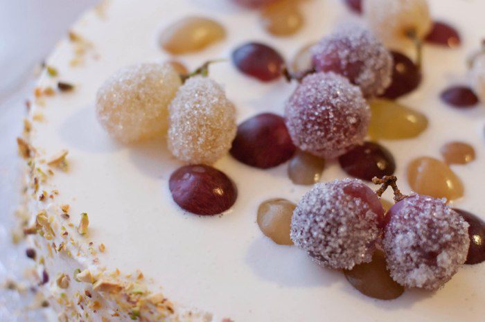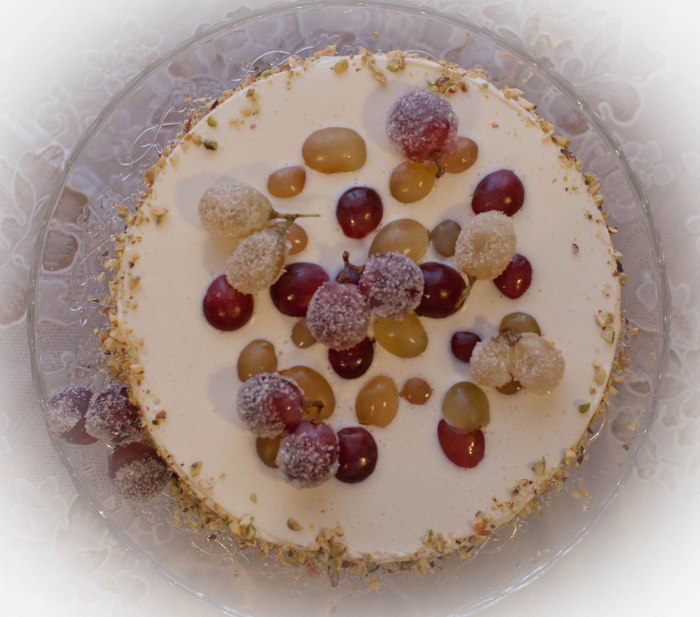 Торт освободить от формы. Отложенные ягоды сбрызнуть лимонным соком, обвалять в сахаре и дать высохнуть. Взбить сливки с ванильным сахаром (я взбиваю с сахарной пудрой) и выложить на торт (намазать сливками бока торта). Фисташки мелко нарезать ножом. Украсить засахаренным виноградом и фисташками.