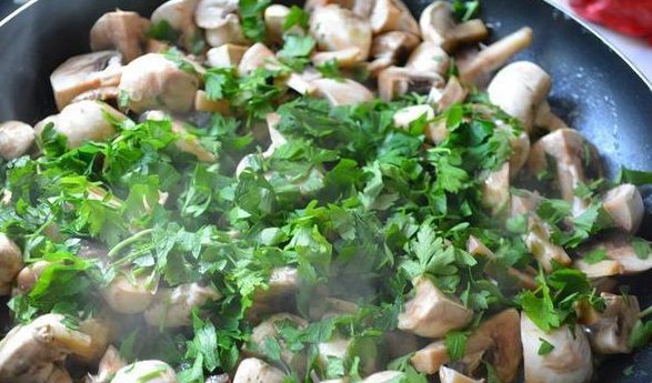 Зелень помыть, обсушить и порубить. Добавить к грибам, перемешать и снять с огня!