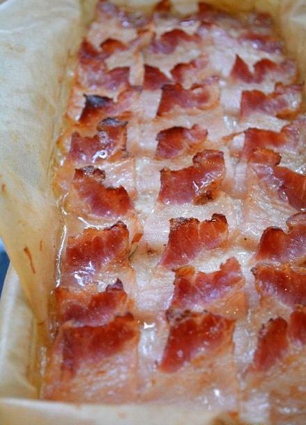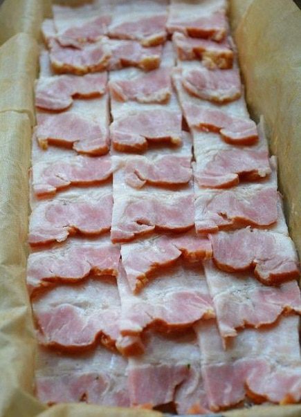 Выложить оставшийся фарш, разровнять и уложить ломтики бекона. Выпекать при Т 180 С 40 минут.